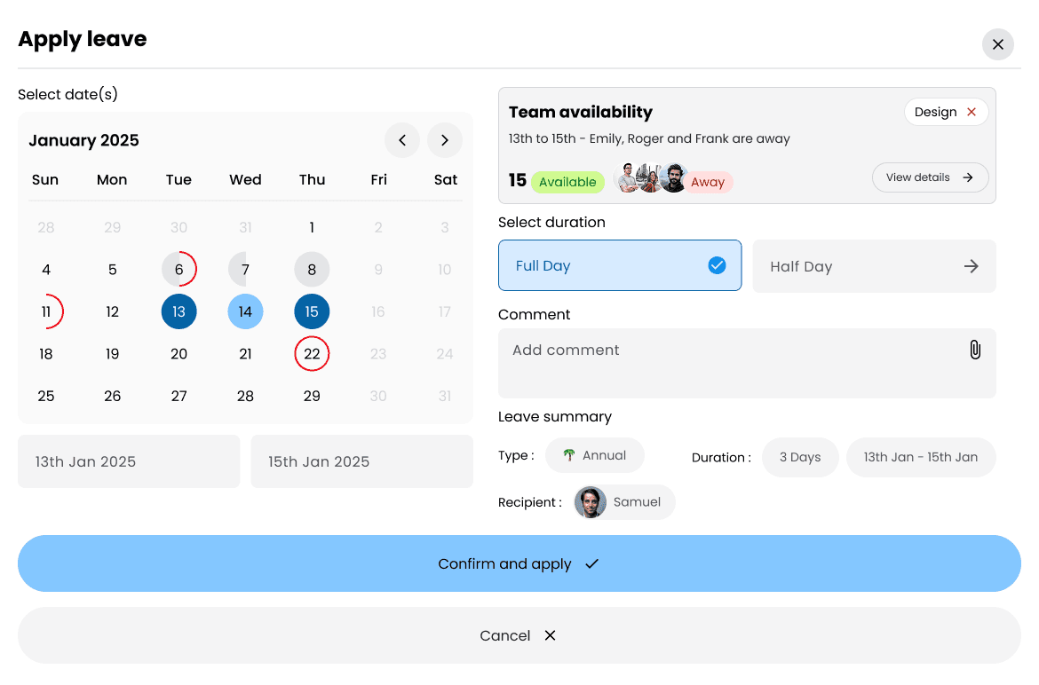Once everything is confirmed, click Confirm and apply to submit the leave request.