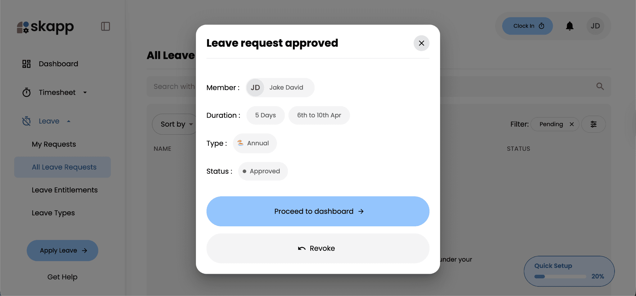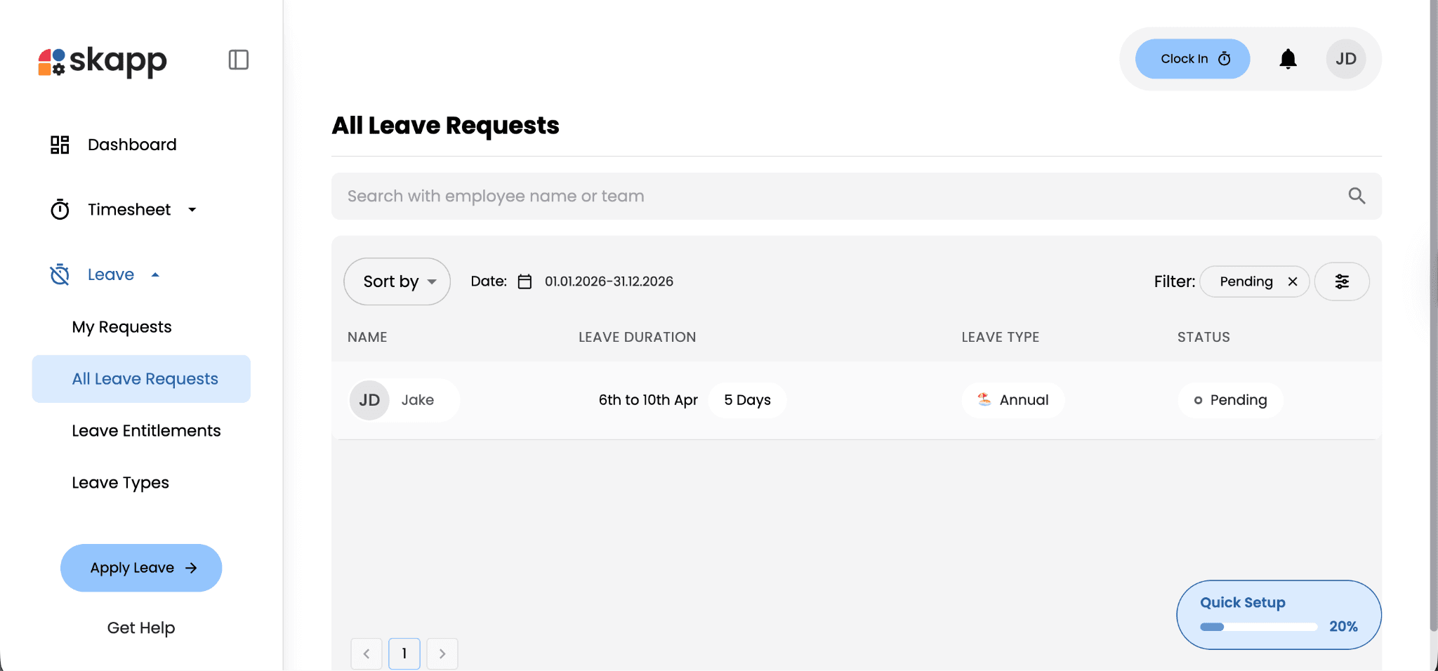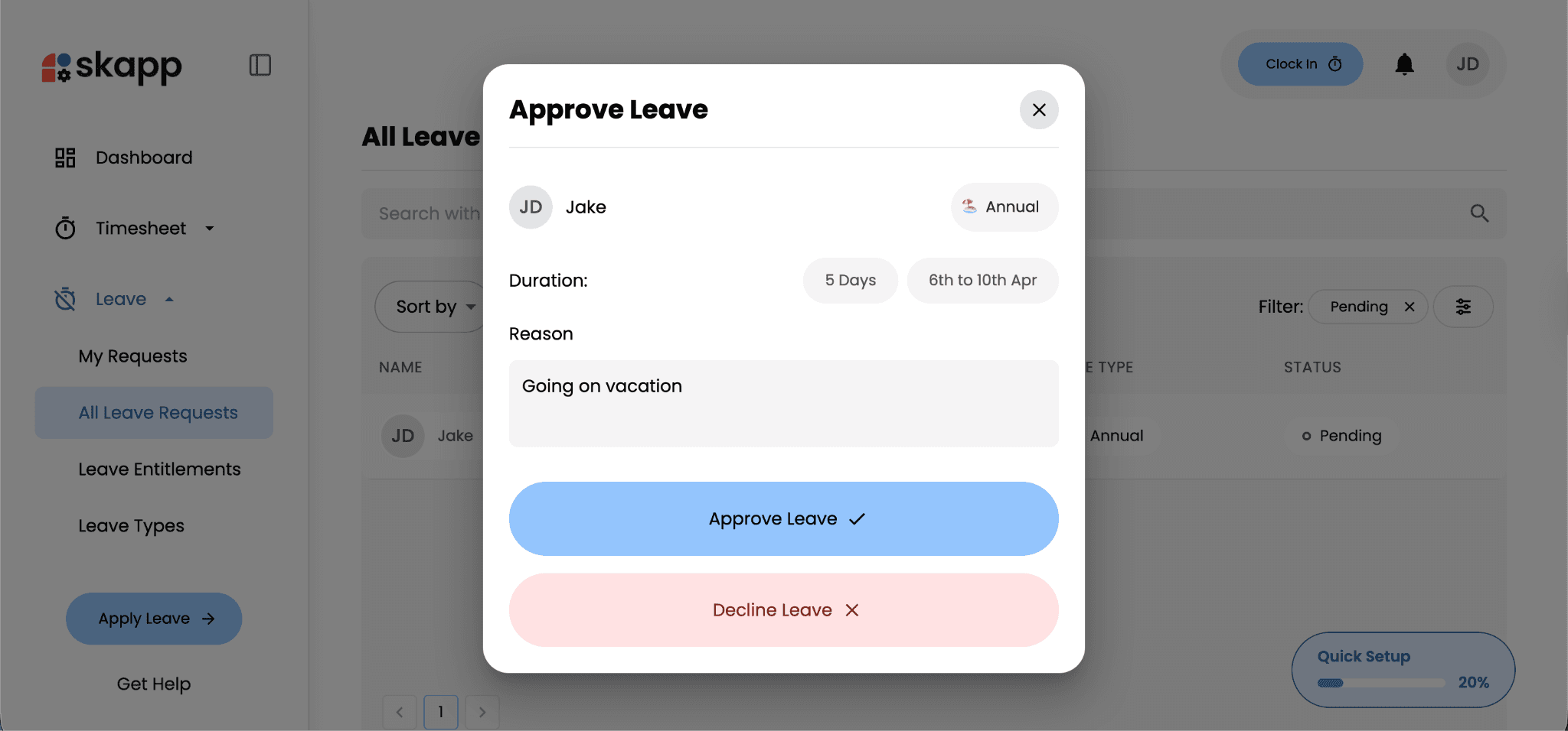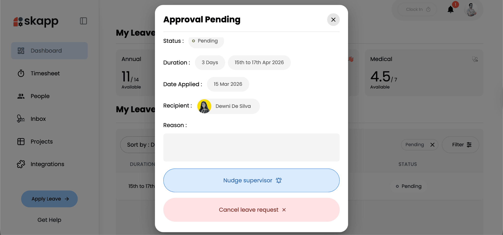 Managers and supervisors can review and manage employee leave requests directly within Skapp. The system provides a clear overview of pending requests, making it easier to review leave details before making a decision.