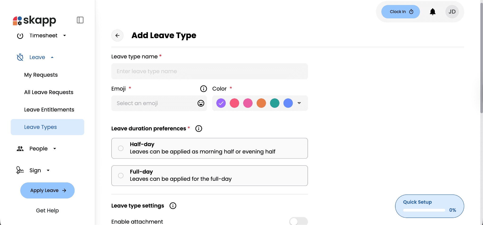 Start by entering the leave type name, selecting an emoji, and assigning a color. These help make different leave categories easy to identify across the system.