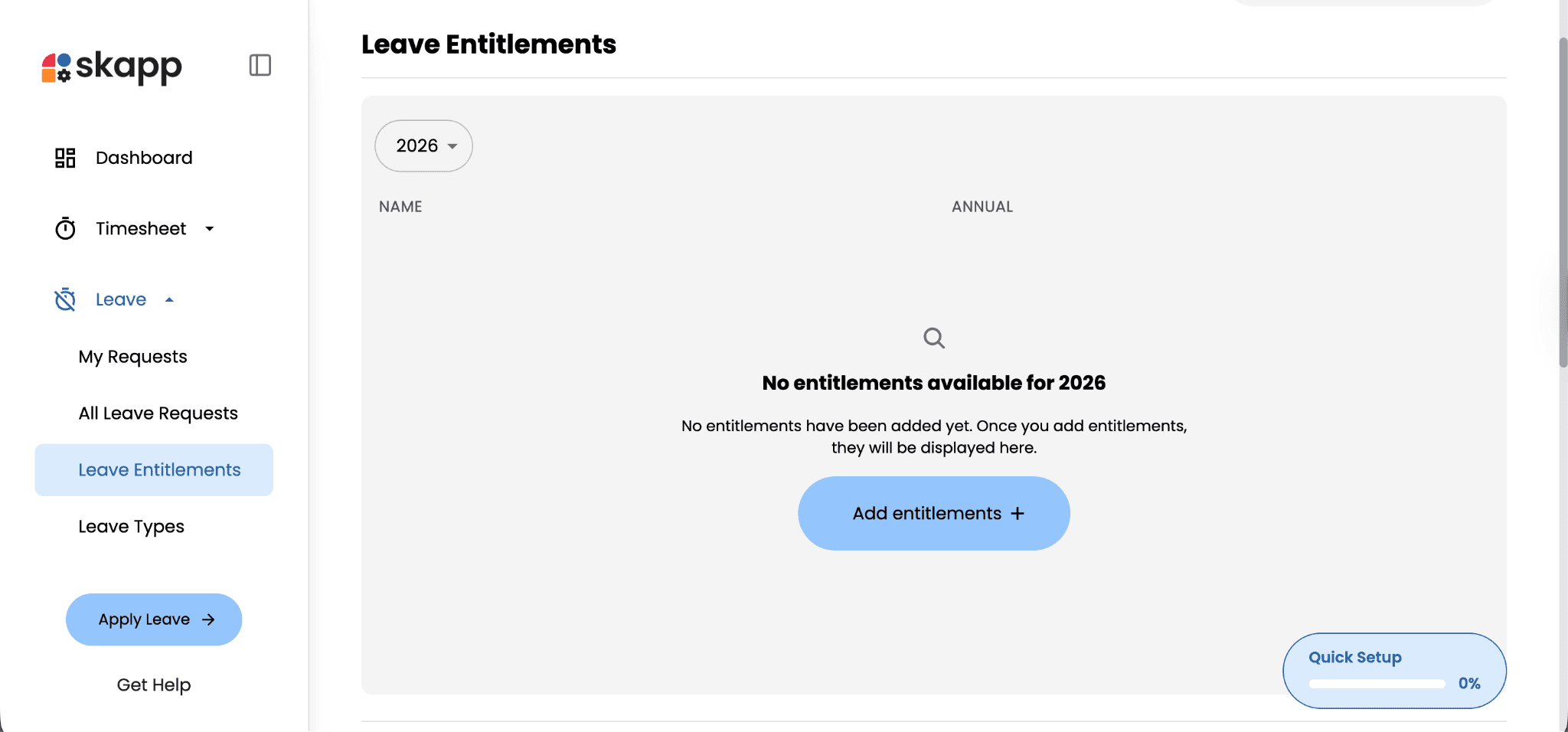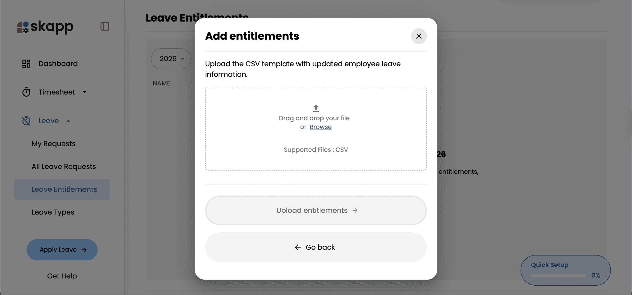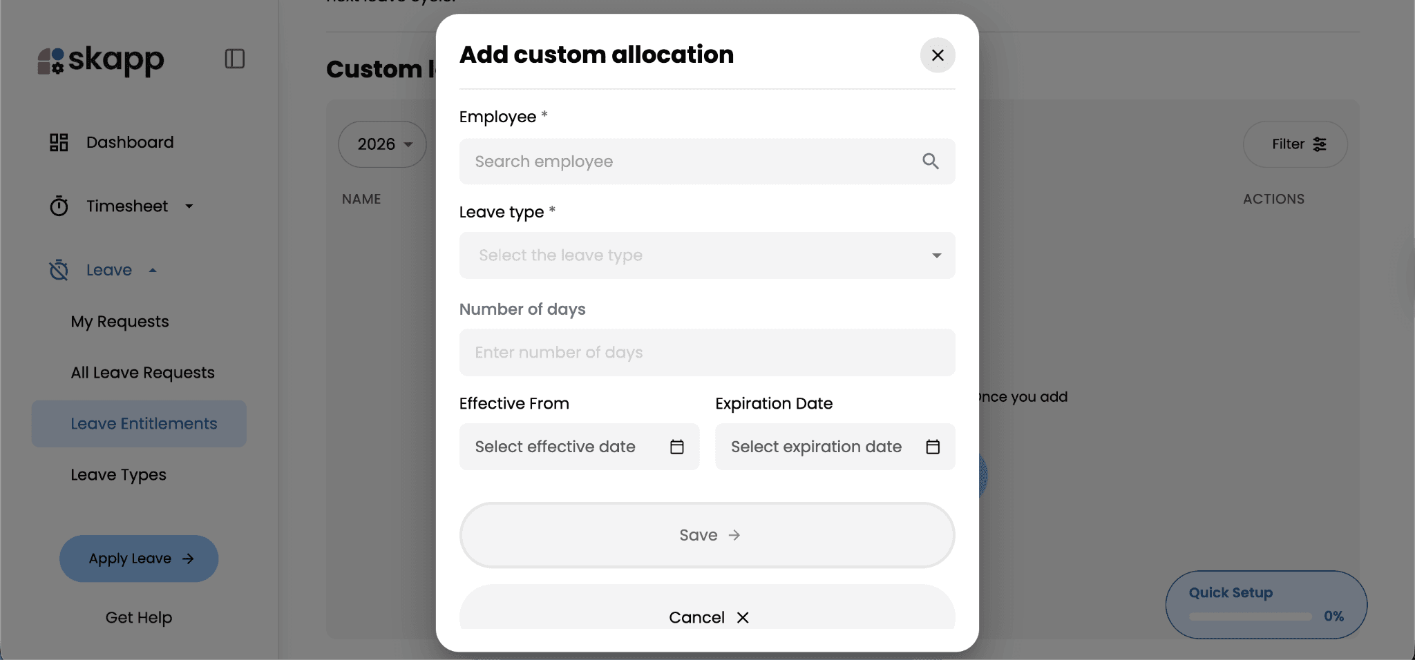 Leave entitlements define how much leave employees are eligible to take during a specific period. In Skapp, administrators can assign these entitlements in bulk using a CSV template or create individual allocations when specific employees require custom leave balances.