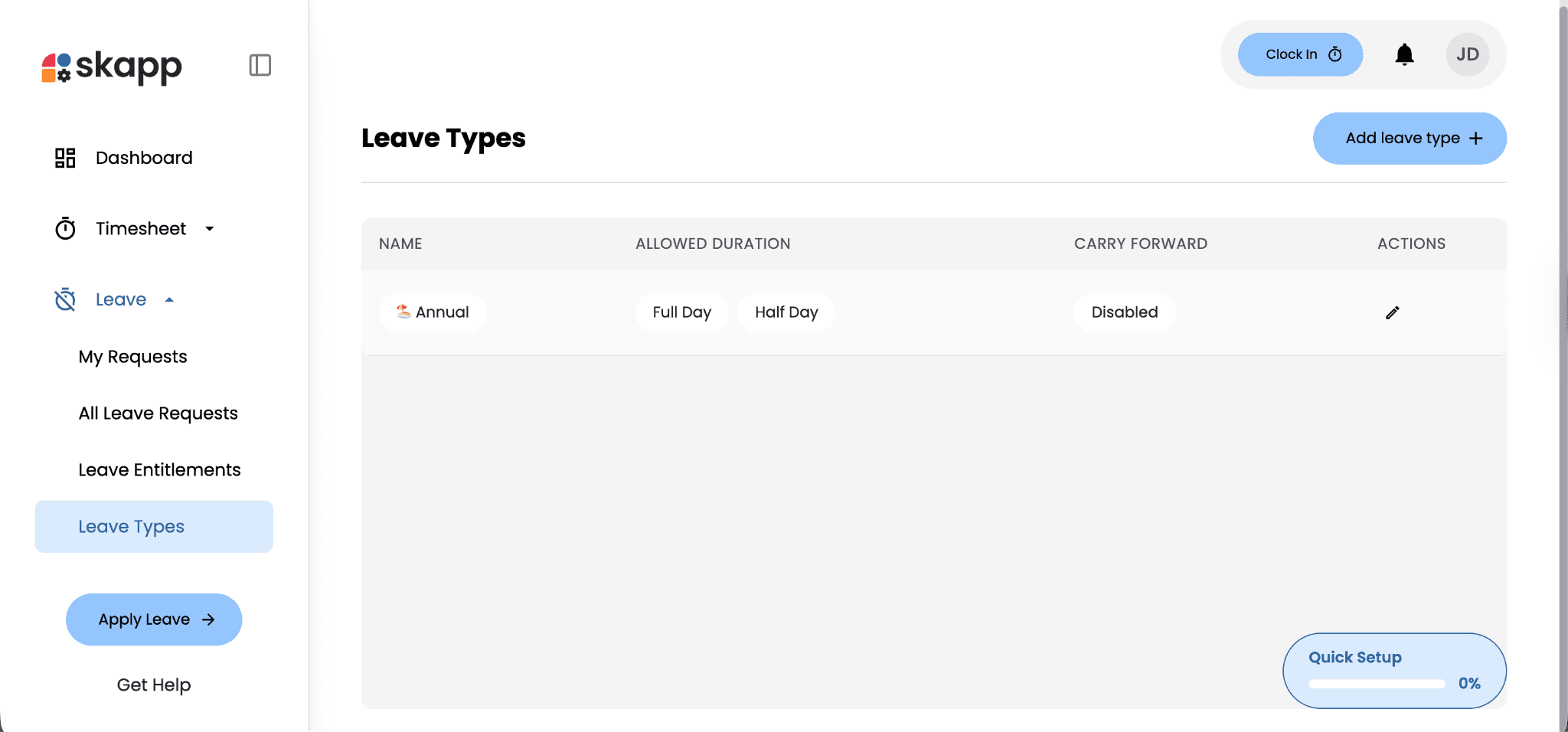Leave types define the different categories of leave employees can request within your organization. These could include common types such as annual leave, sick leave, unpaid leave, or any custom leave category based on your internal policies.