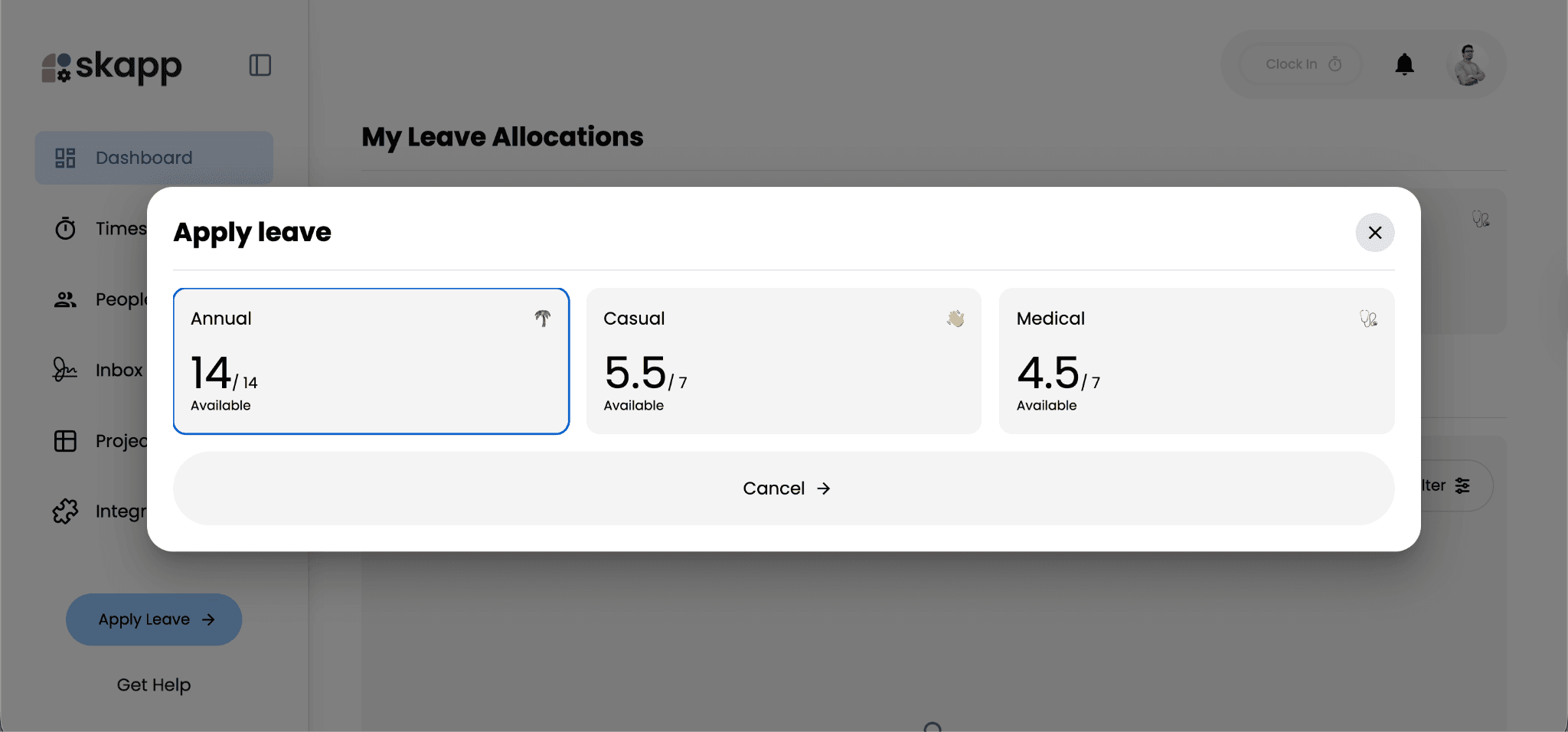 First, choose the type of leave you want to apply for. Skapp displays your available leave balance for each leave type, helping you quickly understand how much leave you still have remaining before submitting a request.