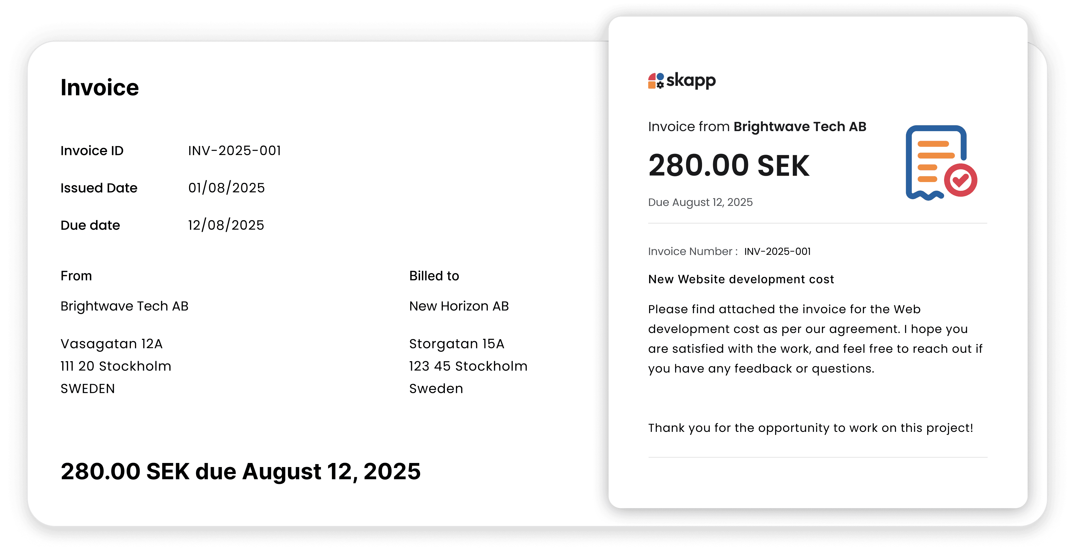 Deliver your invoice straight from Skapp and follow its status. See what’s paid, pending, or overdue, and keep your billing on track without extra tools or manual follow-ups.
