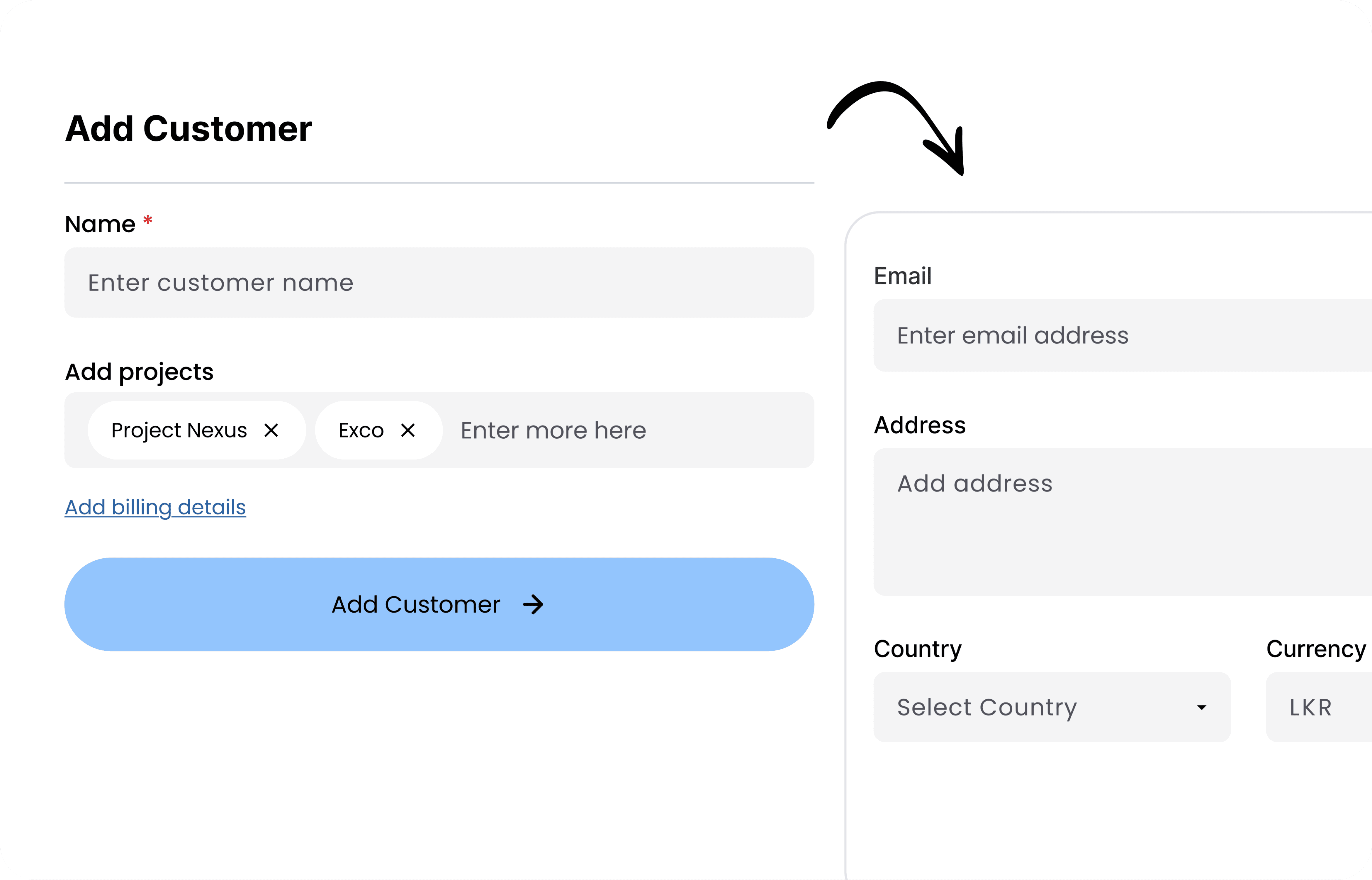 Add customer details including billing information, address, currency, and references. Link projects, agreements, and past invoices to each customer so everything stays organised in one place and easy to access when you need it.