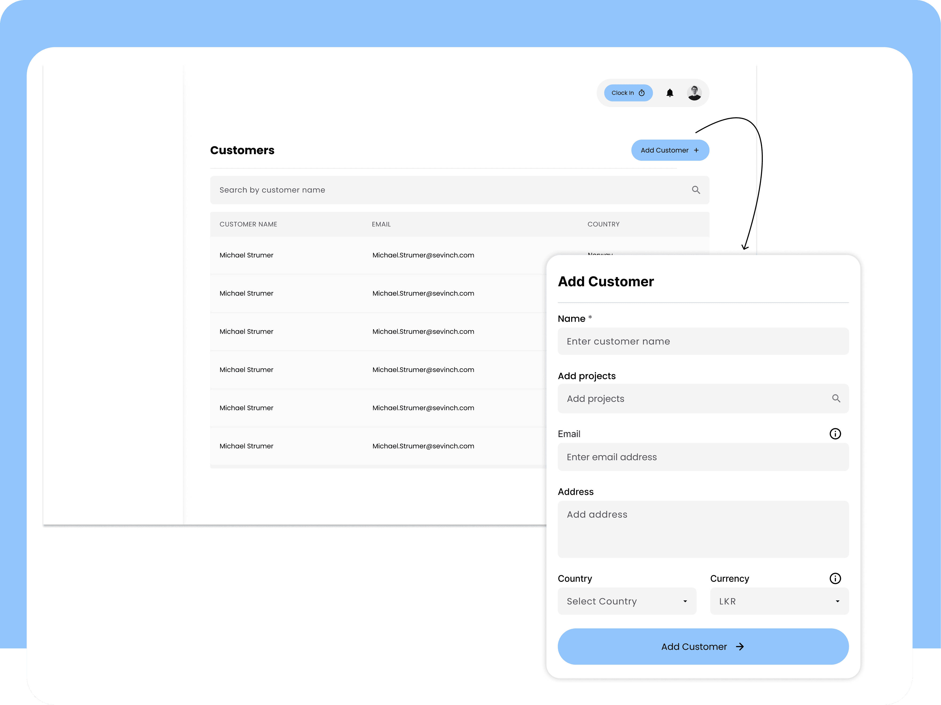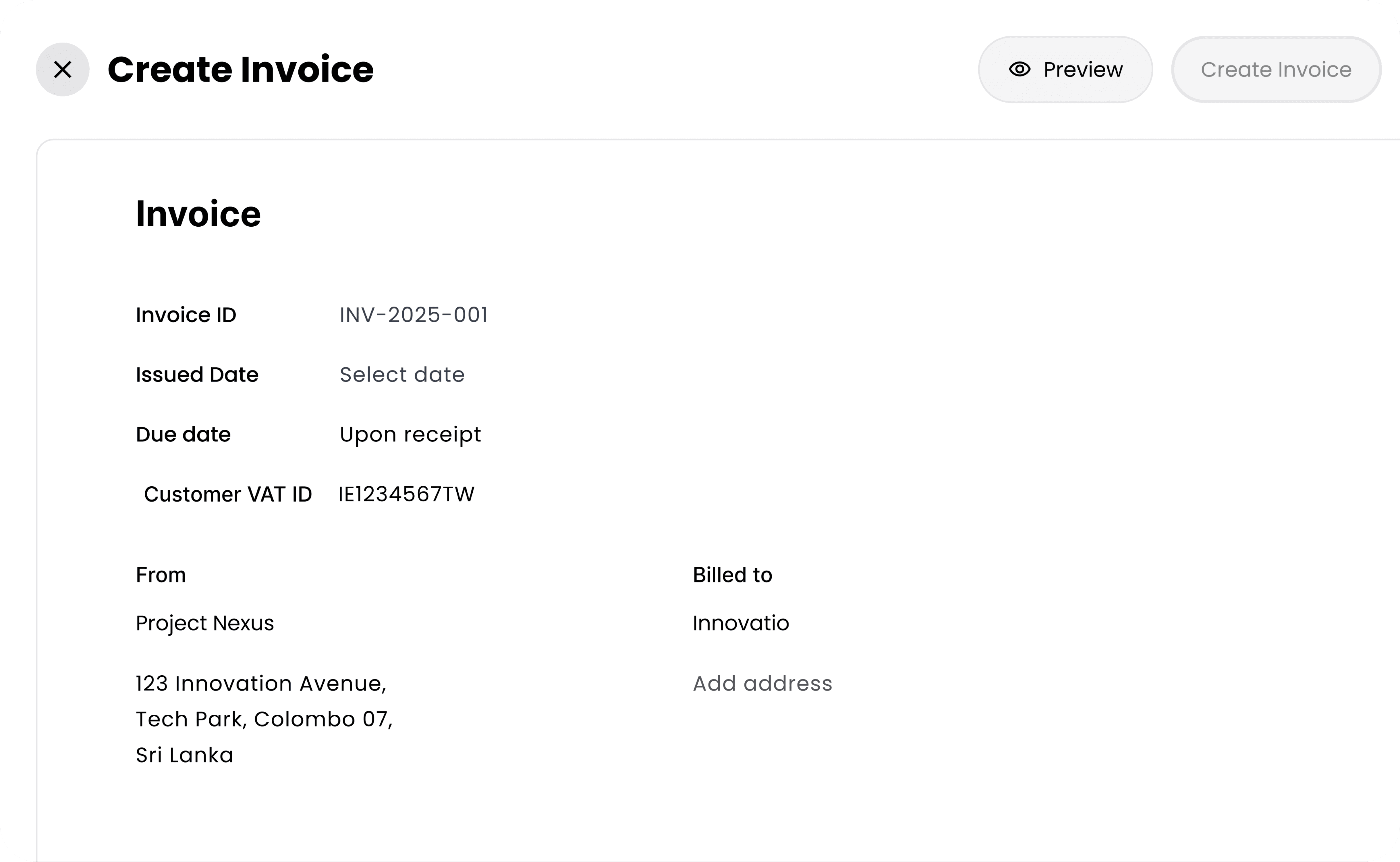 Store every customer’s billing information, currency, address, and references in one place. Link projects, agreements, and past invoices so you always have full context when billing.
