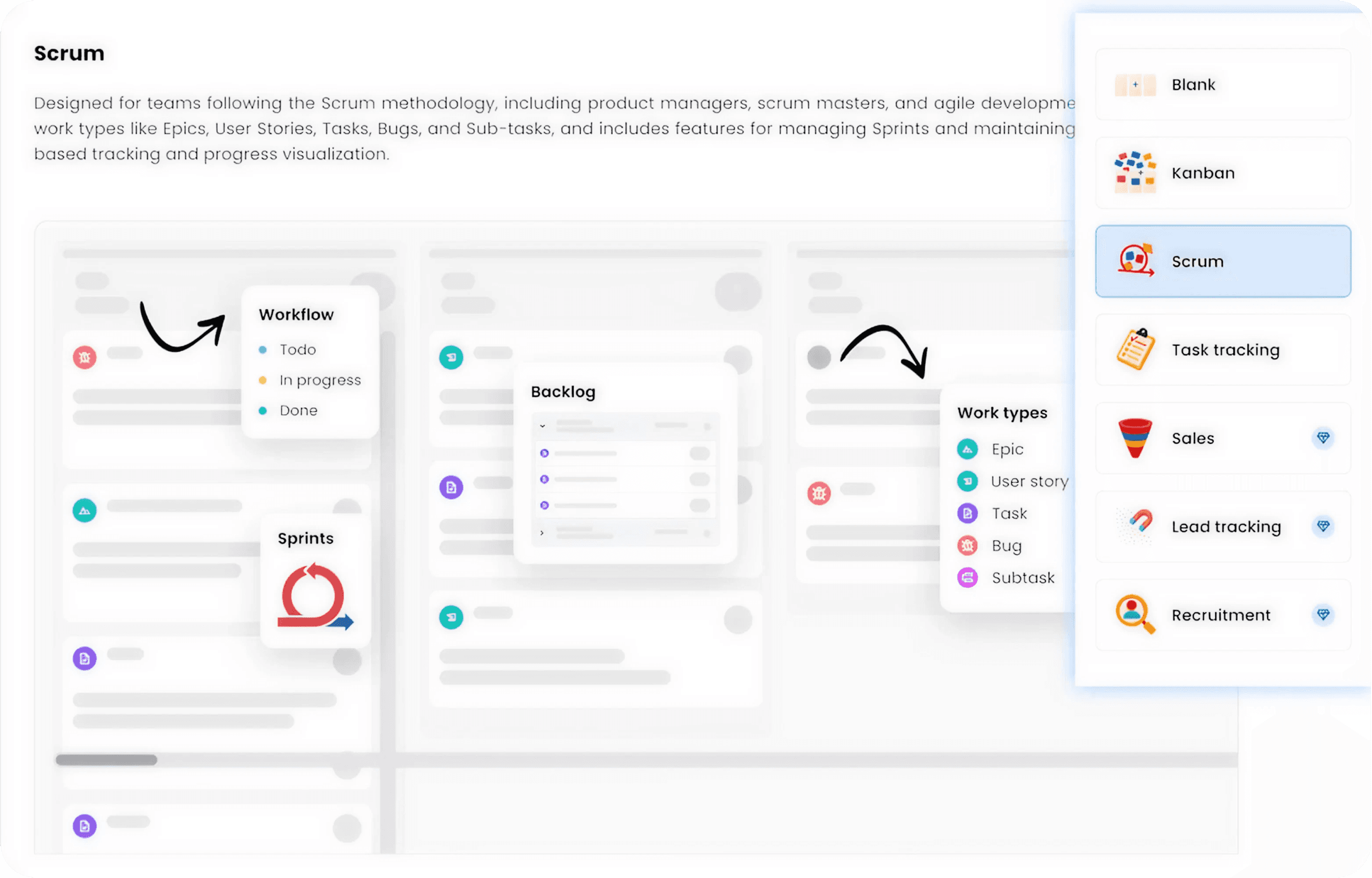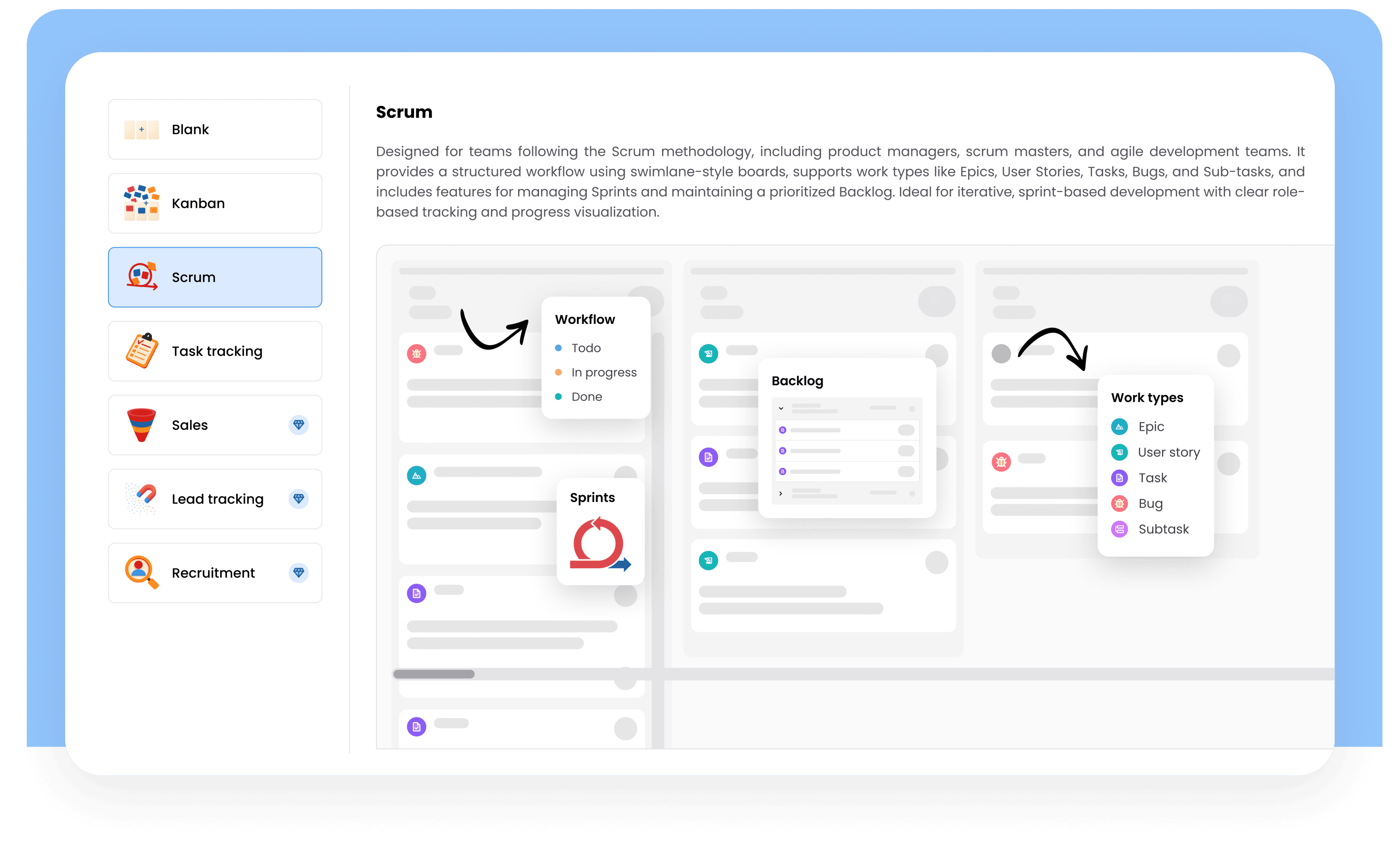 Choose from ready-to-use templates like Kanban, Scrum, or Task Tracking - or build your own from scratch. Every template is fully customizable, so you can create a workflow that fits exactly how your team plans, tracks, and delivers work.