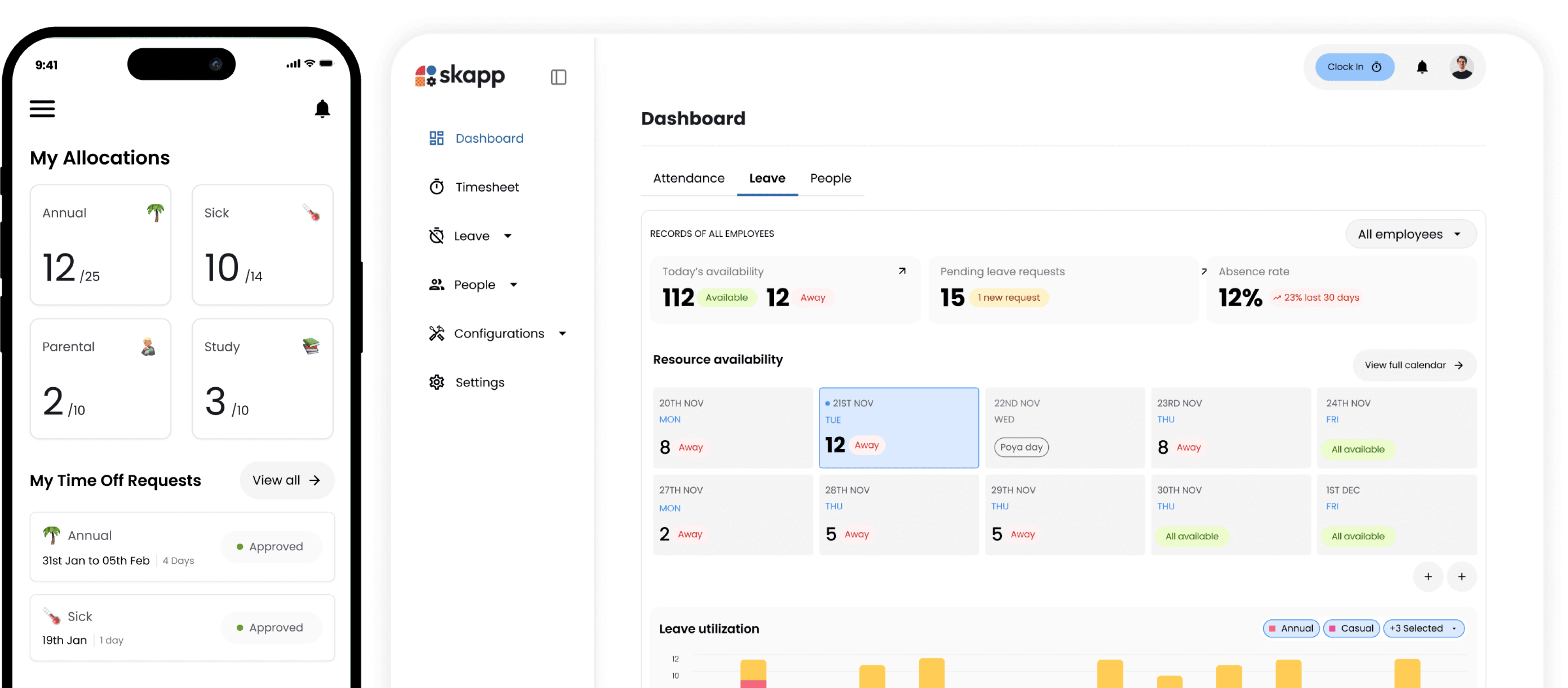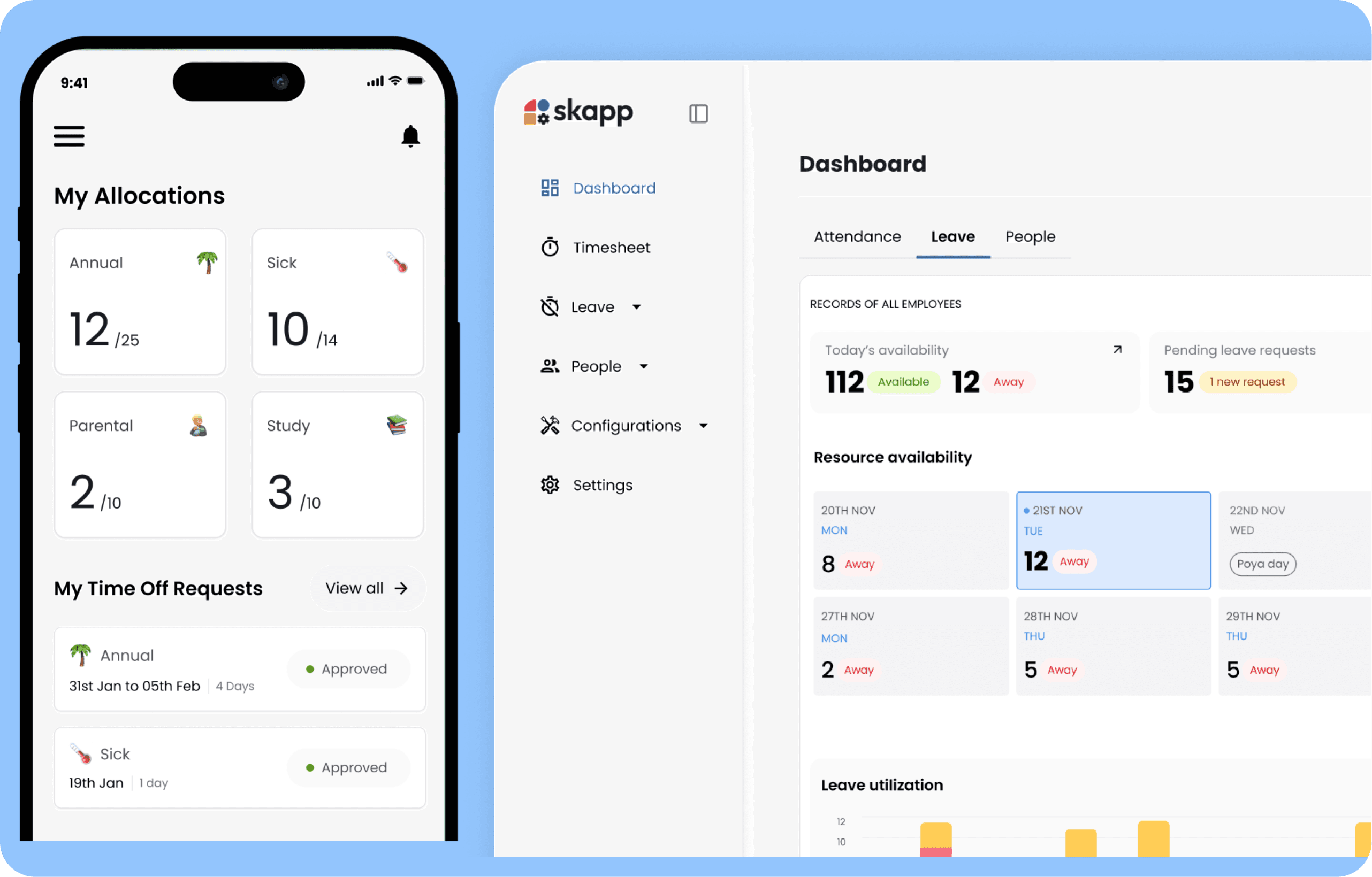 Apply for leave, approve requests, and check availability from anywhere. The Skapp mobile app ensures that time-off management is as easy on the go as it is at your desk.